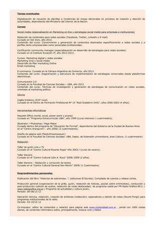 Este documento presenta el currículum vitae de Máximo Paz, un comunicador de 39 años. Paz ha estudiado ciencias de la comunicación y cuenta con experiencia en gestión de cobranzas, digitalización y procesamiento de datos bancarios, tareas administrativas y de atención al cliente. También ha trabajado de forma independiente en servicios legales, redacción y producción de contenidos para radio y web. Paz busca empleo en comunicación, marketing o administración y pretende una remuneración de $4500.