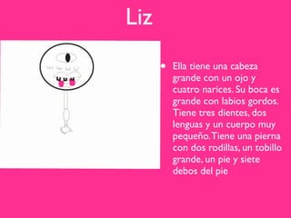 Liz • Ella tiene una cabeza grande con un ojo y cuatro narices. Su boca es grande con labios gordos. Tiene tres dientes, dos lenguas y un cuerpo muy pequeño. Tiene una pierna con dos rodillas, un tobillo grande, un pie y siete debos del pie