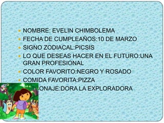 El documento presenta las fichas de tres personas que incluyen su nombre, fecha de cumpleaños, signo zodiacal, aspiraciones futuras, colores y comidas favoritas, y personajes preferidos. Evelin Chimbolema nació el 10 de marzo y le gusta la pizza y Dora la Exploradora, mientras que Veronica Jordan del 3 de agosto es fanática de Hello Kitty y Jhomaira Zurita del 1 de marzo aspira a ser profesional y le encanta Minnie.