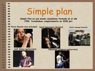 Simple plan Simple Plan es una banda canadiense formada en el año 1999, formándose completamente en 2000 por: Pierre Bouvier (voz principal) David Desrosiers (bajista) Sébastien Lefebvre (guitarrista) Jeff Stinco (guitarrista) Chuck comeau( batería)