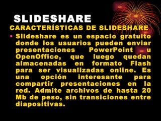 Slideshare permite a los usuarios subir presentaciones en formato PowerPoint u OpenOffice para compartirlas en línea de forma gratuita. Una vez subida, la convierte a formato Flash y genera una URL pública para verla. Los usuarios pueden añadir comentarios y compartir la presentación a través de correo electrónico o enlazarla en su página web. El documento explica paso a paso cómo subir una presentación a Slideshare y obtener el código HTML para insertarla en un blog.