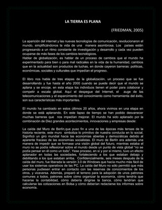 El documento resume los principales factores que han contribuido a la globalización y al "aplanamiento" del mundo en las últimas décadas. Estos incluyen la caída del Muro de Berlín, el surgimiento de Internet y las compañías pioneras como Netscape, el modelo de negocio de Walmart, el acceso a la información a través de Internet y Google, y la expansión de la banda ancha inalámbrica. El documento argumenta que estas fuerzas han eliminado barreras, democratizado el conocimiento y simplificado la vida de las personas a nivel global