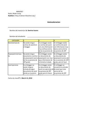 El documento presenta una rúbrica para la autoevaluación de un proyecto sobre ecuaciones de segundo grado. La rúbrica evalúa tres categorías: archivo Word con información sobre ecuaciones de segundo grado, documento PowerPoint sobre el tema, y archivo Excel con ejercicios. Se califica de 1 a 5 puntos dependiendo del nivel de detalle e implementación de cada recurso en el blog del estudiante.