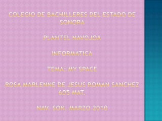 El documento describe cómo crear y usar una cuenta en MySpace, un sitio de interacción social que permite a los usuarios compartir perfiles, amigos, grupos y multimedia. Se detallan funcionalidades como boletines, grupos, mensajería instantánea y opciones para compartir videos. También se explican los pasos para subir videos a la plataforma.