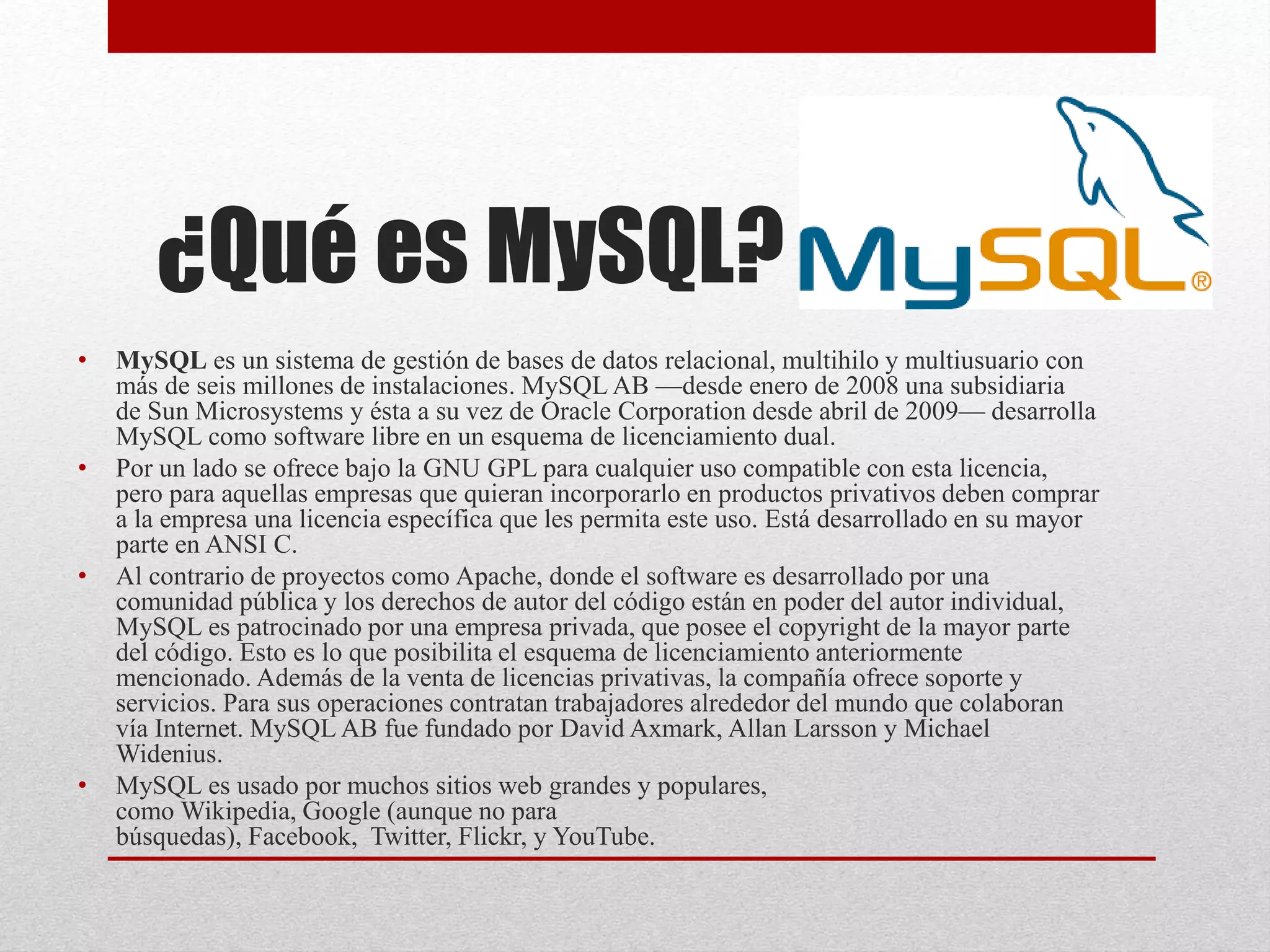 MySQL es un sistema de gestión de bases de datos relacional, multihilo y multiusuario desarrollado principalmente en C. Es software libre bajo licencia GPL aunque también se ofrecen licencias privativas. Es popular para sitios web grandes debido a su rapidez en lectura y uso común con PHP. Ofrece características como transacciones, claves foráneas e indexación de texto.
