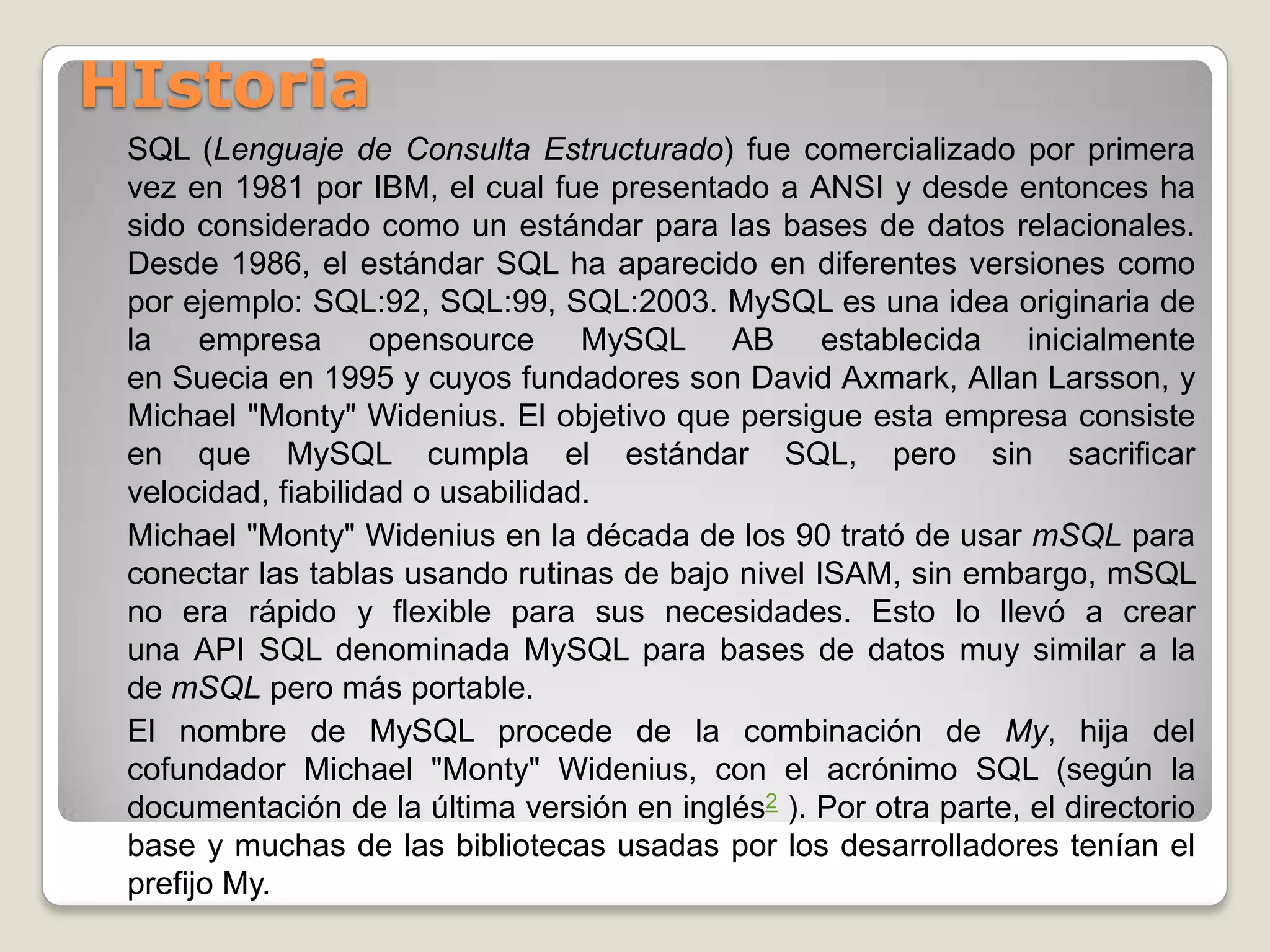 MySQL es una base de datos relacional, multihilo y multiusuario desarrollada principalmente en C y licenciada bajo GPL. Es mantenida y patrocinada por Oracle Corporation, quien ofrece licencias privativas y soporte. Fue creada en 1995 por Michael Widenius para superar las limitaciones de mSQL en velocidad, flexibilidad y portabilidad. Funciona en múltiples sistemas operativos incluyendo Linux, Windows, y varias versiones de Unix.