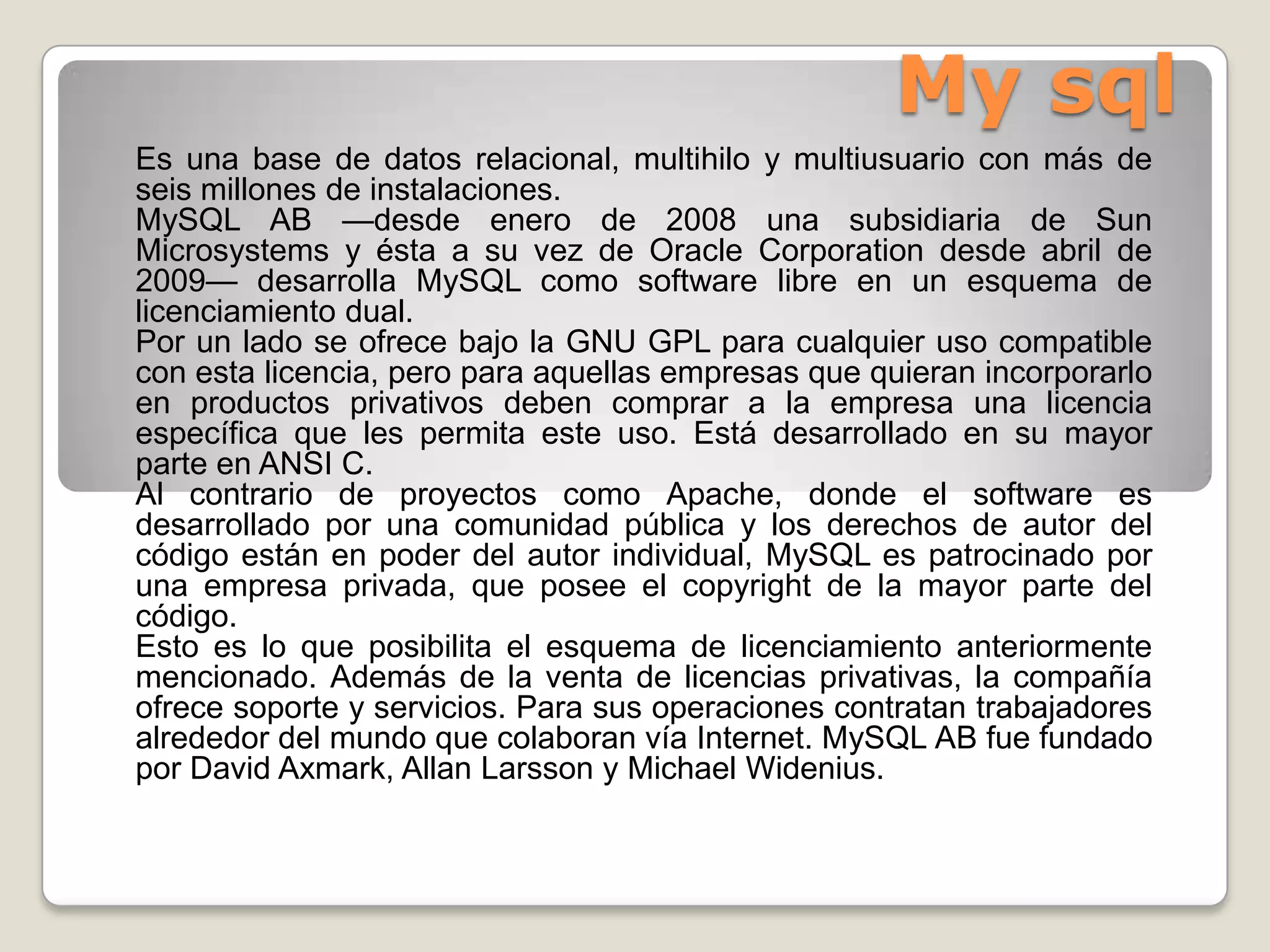 MySQL es una base de datos relacional multiusuario y multihilo con más de seis millones de instalaciones. Es desarrollado por la empresa MySQL AB como software libre bajo licencia GPL, pero también ofrece licencias privativas. Funciona en múltiples plataformas y es usado para varias aplicaciones.