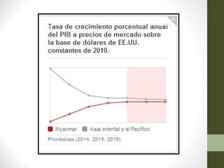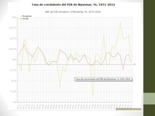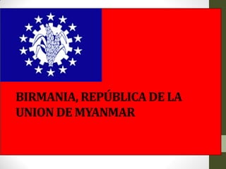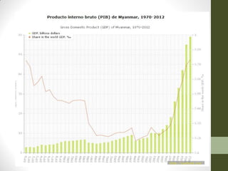 Este documento proporciona información sobre Birmania/Myanmar. Describe su ubicación geográfica, población, cultura, política, economía, comercio e índices de desarrollo humano. Birmania limita con varios países y tiene varios grupos étnicos. Su economía depende en gran medida de la agricultura y la silvicultura. Políticamente fue gobernada por una dictadura militar durante décadas y actualmente transita hacia una democracia.
