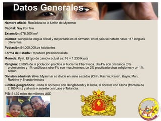 Myanmar (Birmania) es una república presidencialista ubicada en el sudeste asiático, con una población mayoritaria budista de 54 millones de habitantes. Limita con Bangladesh, India, China, Laos y Tailandia. Aunque posee recursos naturales, su economía se ha visto afectada por décadas de aislamiento y mala gestión, siendo uno de los países más pobres de la región.