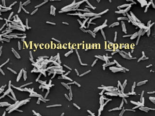 Este documento describe Mycobacterium leprae, el bacilo que causa la lepra. M. leprae es una micobacteria descubierta en 1873 que vive de forma intracelular en los macrófagos y células de Schwann. Causa lepra en su forma lepromatosa, que es sistémica e infectante, y en su forma tuberculoide, que es localizada y no transmisible. El tratamiento incluye dapsona, rifampicina y clofazimina.