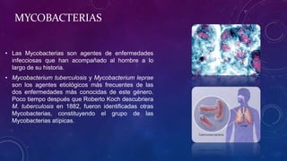 La tuberculosis es una enfermedad infecciosa causada por la bacteria Mycobacterium tuberculosis. Se transmite a través de gotículas en el aire de personas infectadas y causa tos con flema que puede contener sangre, fiebre, pérdida de peso y debilidad. El diagnóstico requiere cultivo bacteriológico e imágenes de rayos X en los pulmones. Se trata con una combinación de medicamentos como isoniazida y rifampicina durante varios meses para prevenir la resistencia bacteriana.