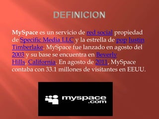 MySpace es una red social fundada en 2003 en California. Fue adquirida por News Corporation en 2005 y llegó a ser la red social más popular del mundo en 2006. Sin embargo, desde 2008 ha ido perdiendo usuarios de forma constante debido a la creciente popularidad de Facebook. MySpace ha realizado varios cambios de diseño y funcionalidad para intentar competir mejor con Facebook.