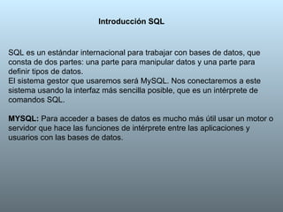 El documento describe los conceptos básicos de SQL y MySQL, incluyendo que SQL consta de dos partes para manipular y definir datos, que MySQL es un sistema gestor de bases de datos que permite acceder a bases de datos, y que existen dos lenguajes en SQL: DDL para definir datos y DML para manipularlos.
