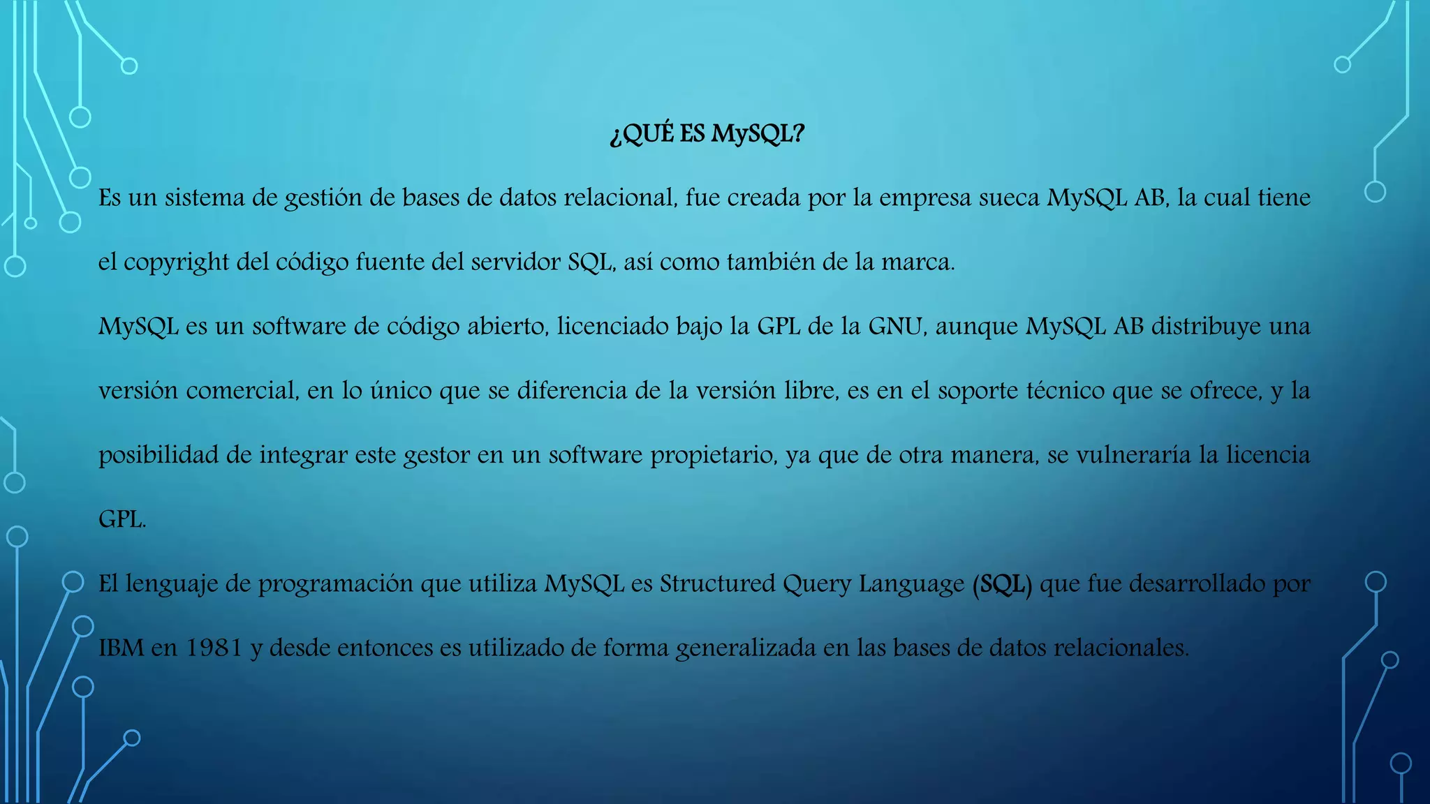 MySQL es un sistema de gestión de bases de datos relacional de código abierto licenciado bajo GPL. Fue creado en los años 90 y ha ganado popularidad debido a su simplicidad, velocidad y capacidad de ejecutarse en máquinas con pocos recursos. Entre sus principales características se encuentran su velocidad, soporte de múltiples tipos de datos y portabilidad entre sistemas operativos.