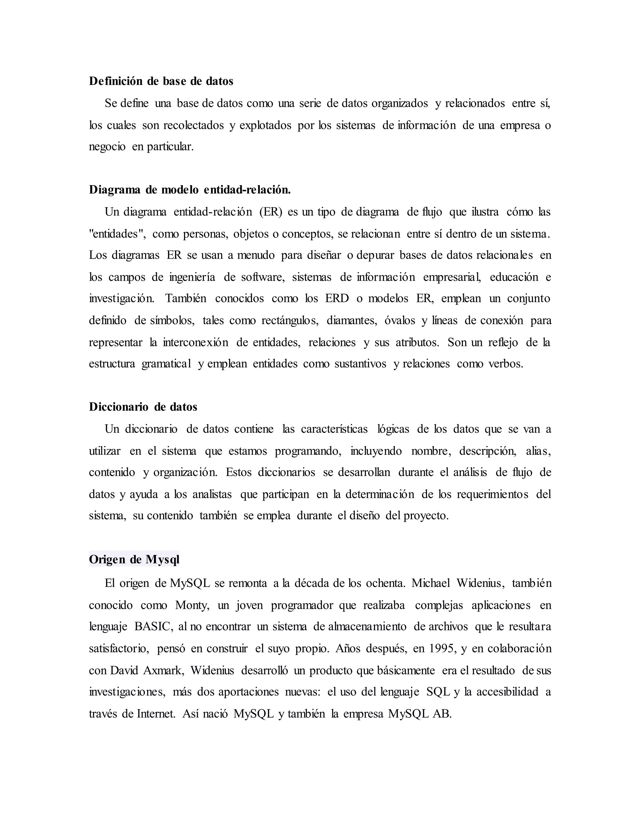 El documento define una base de datos, describe diagramas entidad-relación y sus usos para diseñar bases de datos, explica qué es un diccionario de datos y cómo se usa durante el análisis y diseño de sistemas, y resume los orígenes de MySQL y cómo se desarrolló a partir de investigaciones individuales en los años 80 y 90.