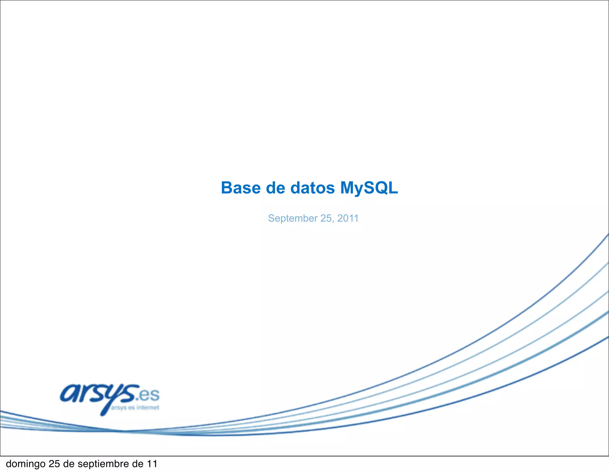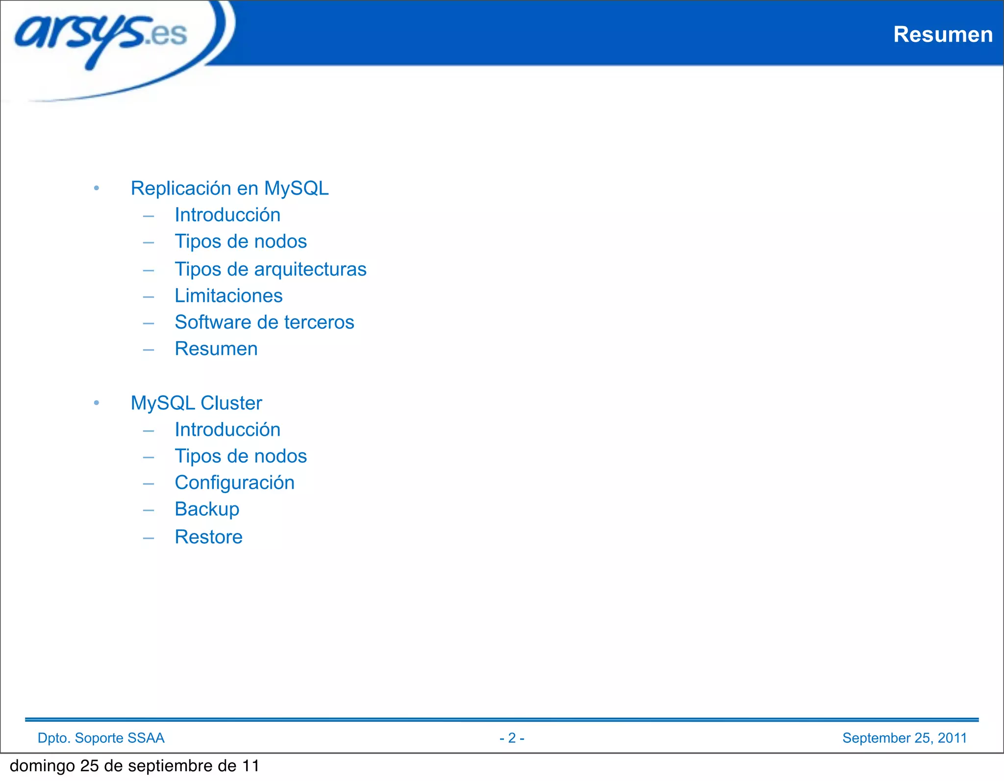Este documento proporciona una introducción a la replicación en MySQL, incluyendo los tipos de nodos, arquitecturas y limitaciones. También describe soluciones de terceros como MySQL Proxy, Galera y Tungsten que pueden usarse para superar algunas limitaciones y lograr alta disponibilidad y escalabilidad.
