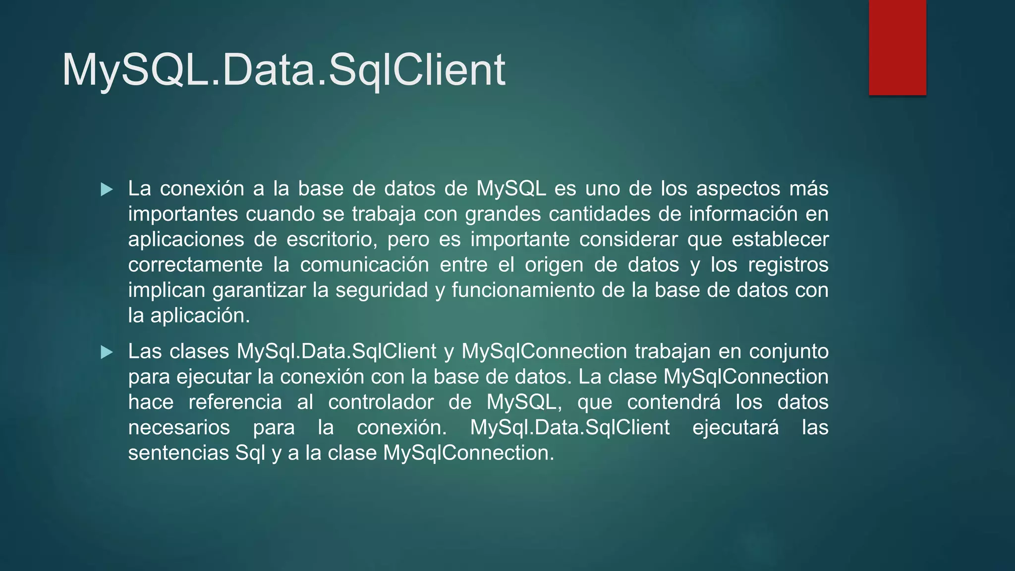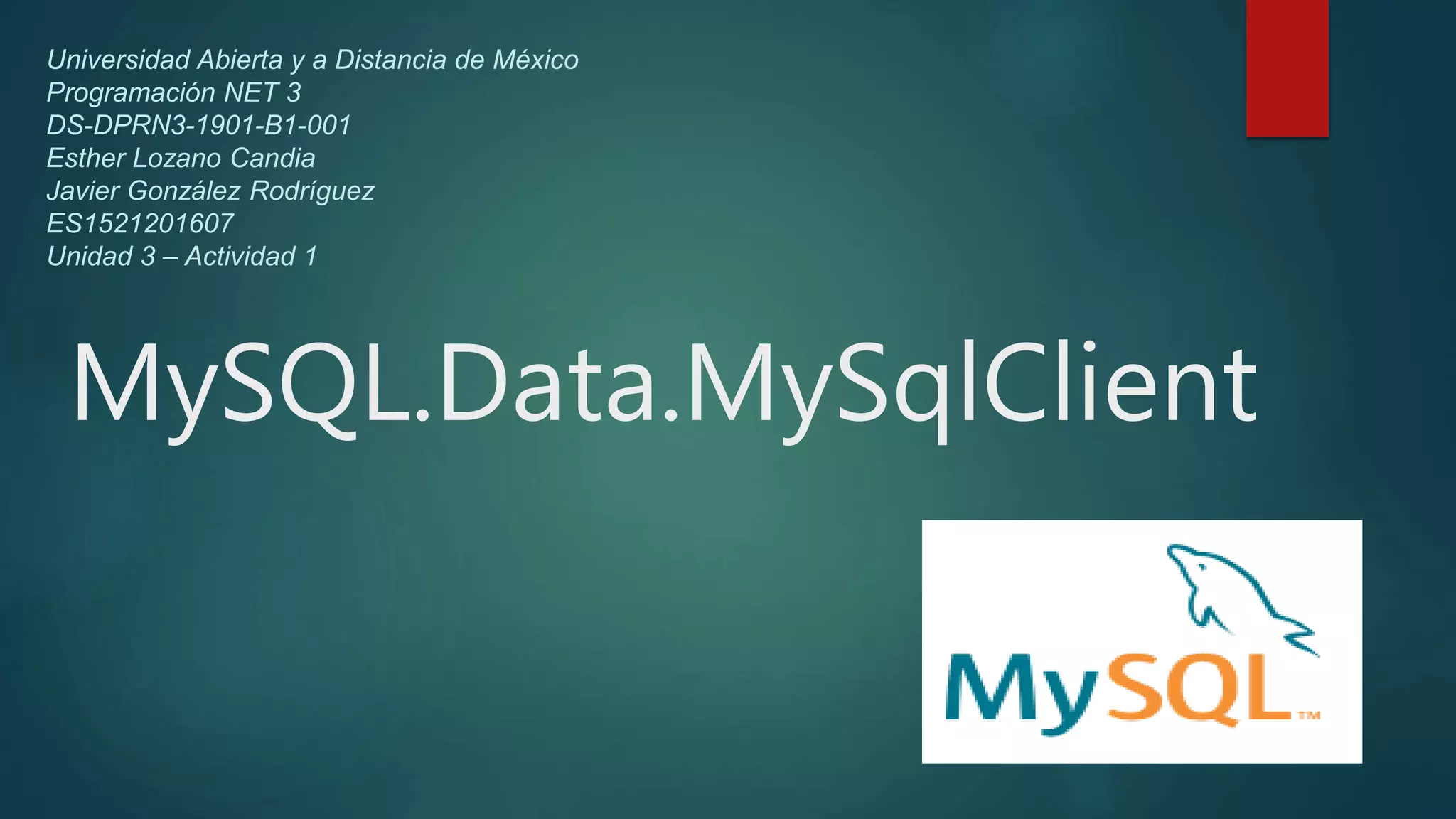 El documento describe los pasos para instalar el conector de MySQL en Visual Studio .NET y establecer una conexión con una base de datos MySQL. Explica que las clases MySql.Data.SqlClient y MySqlConnection trabajan juntas para ejecutar la conexión y que MySqlConnection se refiere al controlador MySQL que contiene los datos de conexión. Además, detalla los pasos de descarga e instalación del controlador MySQL y agregar las referencias necesarias en un proyecto de Visual Studio.