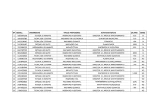 El documento lista 20 registros que incluyen el número de cédula, universidad, título profesional, actividad actual, salario e indica si ejerce o no la profesión de cada persona. La mayoría de las personas ejercen cargos directivos o de mantenimiento y sus salarios varían entre los 100 a 2000 dólares.