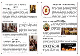 El documento habla sobre las celebraciones de diciembre en la orden franciscana secular, incluyendo la Inmaculada Concepción, la Navidad, y el comienzo de un nuevo año. También menciona las actividades pasadas de la fraternidad local como celebrar santos patrones y recaudar fondos.