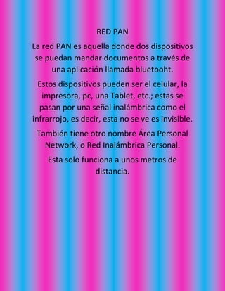 El documento proporciona información sobre una Red PAN (Red Personal de Área), la cual permite el intercambio de documentos entre dos dispositivos como celulares, impresoras y tabletas a través de Bluetooth de forma inalámbrica a una distancia de unos metros. La Red PAN también se conoce como Red Inalámbrica Personal o Área Personal Network. El documento incluye un diagrama de esta red.