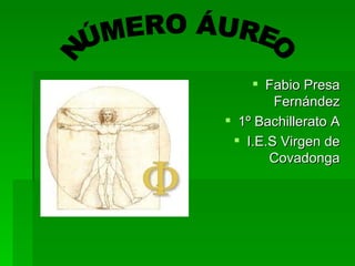 El documento habla sobre el número áureo o número de oro, que es un número irracional representado por la letra griega φ. Explica cómo se calcula este número y describe su presencia en las matemáticas, la naturaleza y el misticismo. En las matemáticas, se usa para obtener números en proporción áurea. En la naturaleza, se encuentra en la sucesión de Fibonacci, la disposición de pétalos y hojas de las plantas. En el misticismo, la cruz latina tiene proporciones relacionadas con el