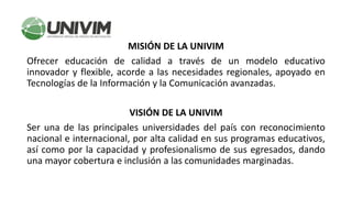 El documento presenta el modelo educativo de la UNIVIM, centrado en el estudiante y basado en el desarrollo de competencias a través de la relación entre tutor, estudiante, contenidos digitales y tecnologías. El modelo busca formar profesionistas competentes para resolver problemas sociales actuales y futuros considerando las características de la sociedad del conocimiento e impulsando la inclusión, diversidad y participación democrática.