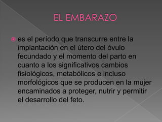 El embarazo es el período entre la implantación del óvulo fecundado y el parto, durante el cual la mujer experimenta cambios fisiológicos, metabólicos y morfológicos destinados a proteger y nutrir al feto. Estos cambios incluyen la congestión y turgencia de los senos debido al aumento de hormonas como la prolactina, así como estados de ánimo inestables, irritabilidad, hipersensibilidad e inseguridad.