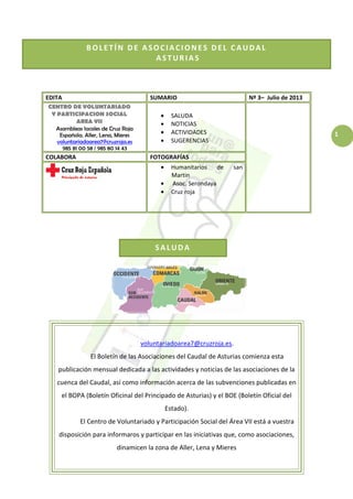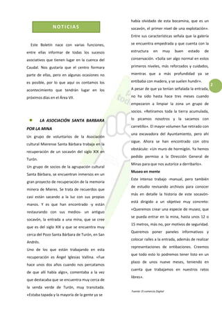El boletín informa sobre las actividades y noticias de las asociaciones de la cuenca del río Caudal en Asturias. Incluye información sobre la recuperación de una mina del siglo XIX por parte de la Asociación Cultural Mierense Santa Bárbara, las VII Jornadas Culturales dedicadas a Joaquín Rodríguez Muñiz organizadas por la Sociedad Humanitaria de San Martín y el Ayuntamiento de Aller, y las actividades de ocio veraniegas para jóvenes organizadas por el Ayuntamiento de Mieres y Cruz Roja.
