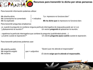 Este documento presenta diferentes recursos lingüísticos para expresar condiciones, transmitir información dicha por otras personas, quejarse y reclamar, y expresar involuntariedad. Entre ellos se incluyen expresiones condicionales como "siempre que", "solo si", y "a menos que"; verbos como "dice" y "pregunta" para transmitir lo dicho u oído; y construcciones con "se" más verbo para indicar sucesos involuntarios.