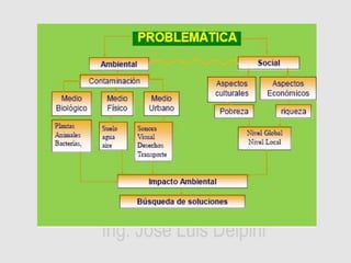 El documento describe problemas ambientales y de salud en la Villa 20 causados por la contaminación con plomo y el mal manejo de residuos. El plomo proviene de un cementerio de autos cercano y causa altos niveles de plomo en la sangre de los residentes, especialmente niños. El objetivo es erradicar el plomo mediante plantas filtradoras, instalar biodigestores para proveer energía y abono, y realizar campañas de concientización.