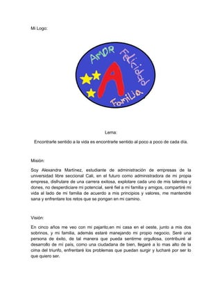 Este documento presenta la misión, visión, principios y valores de Alexandra Martínez, una estudiante de administración de empresas. Su misión es tener una carrera exitosa explotando sus talentos y manteniendo su salud y fidelidad a su familia y amigos. Su visión es tener su propio negocio y ser una persona de éxito en 5 años. Sus principios incluyen amar al prójimo y respetar la vida, y sus valores enfatizan el respeto, la honestidad y la responsabilidad.