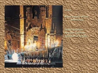 El documento describe la situación precaria de un pueblo que huye de la incertidumbre y el temor hacia un templo en busca de consuelo. Más adelante, la ira y el deseo de libertad de una mujer llamada Fenena amenazan con desatar la furia de la multitud. Finalmente, Nabucodonosor invade el templo y somete al pueblo a la esclavitud, aunque una voz los llama a creer en el futuro.
