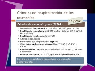 Este documento resume la neumonía adquirida en la comunidad, incluyendo su definición, etiología, factores de riesgo, manifestaciones clínicas, criterios de diagnóstico, tratamiento y prevención. Los patógenos más comunes son Streptococcus pneumoniae, Haemophilus influenzae y Mycoplasma pneumoniae. El diagnóstico requiere hallazgos clínicos e imagen radiográfica de infiltrado pulmonar. El tratamiento depende de la gravedad y factores de riesgo, incluyendo antibió
