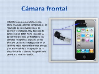 El documento trata sobre la evolución de las cámaras en teléfonos móviles. Explica que las cámaras en teléfonos son el resultado de la convergencia tecnológica y la miniaturización de componentes electrónicos, permitiendo integrar cámaras que requieren menos energía que las cámaras digitales de los años 90. También describe algunos accesorios como bastones para selfis y la cámara Podo que se pega a superficies para facilitar la toma de fotos con el teléfono.
