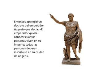 El documento narra el nacimiento de Jesús según el Evangelio de San Lucas. Explica que María y José tuvieron que viajar de Nazaret a Belén para el censo ordenado por el emperador Augusto. Al no encontrar posada, se refugiaron en un establo donde nació Jesús. Los pastores fueron avisados por un ángel de su nacimiento y lo visitaron.