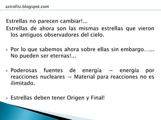 El documento describe las etapas de formación y evolución de las estrellas. Comienza con la acumulación de gas y polvo en nubes moleculares gigantes, que eventualmente colapsan bajo su propia gravedad para formar protoestrellas rodeadas por discos protoplanetarios. Luego, las protoestrellas continúan su contracción hasta que la temperatura en el núcleo alcanza los valores necesarios para iniciar la fusión nuclear, convirtiéndose en estrellas en la secuencia principal.