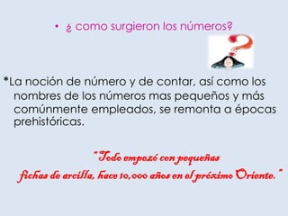 Los números surgieron hace aproximadamente 10,000 años en el Próximo Oriente cuando las tribus primitivas comenzaron a utilizar fichas de arcilla para contar cosechas y negociar con otras tribus. A lo largo de los milenios, varias culturas antiguas como los mesopotámicos, mayas y babilonios desarrollaron sus propios sistemas de numeración. Finalmente, los hindúes inventaron el sistema decimal que usamos hoy en día y los árabes lo extendieron por todo el mundo.