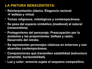 El Renacimiento se caracterizó por un retorno al clasicismo, al antropocentrismo y a la naturaleza. El humanismo se desarrolló a partir del análisis de autores clásicos, buscando modelos teóricos acordes con el hombre. En la pintura renacentista destacó Botticelli, conocido por su delicado dibujo, colorido y gracia en las figuras, plasmando ideas filosóficas, políticas y religiosas de Florencia en el siglo XV. Su obra más famosa es El nacimiento de Venus, que represent