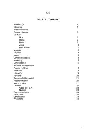 El documento presenta la historia y los logros de las empresas Inveralimenticias y Nacional de Chocolates, destacando su trayectoria desde la fundación hasta su actual posición en el mercado. Ambas compañías, caracterizadas por su innovación y compromiso social, han logrado una amplia cobertura en Colombia y en el extranjero, formando alianzas estratégicas y expandiendo su gama de productos en varios sectores alimenticios. Se enfatiza el impacto de su responsabilidad social y su cultura organizacional que promueve el bienestar de sus empleados y las comunidades donde operan.