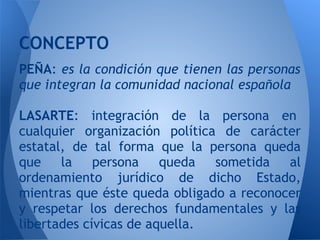 La nacionalidad española se puede adquirir de origen (ius sanguinis o ius soli) o de forma derivativa a través de la opción, carta de naturaleza o residencia. La nacionalidad de origen se obtiene por nacimiento de hijos de padres españoles o nacidos en España, mientras que la derivativa requiere cumplir ciertos requisitos como plazos de residencia, renuncia a otra nacionalidad y juramento de lealtad a España.