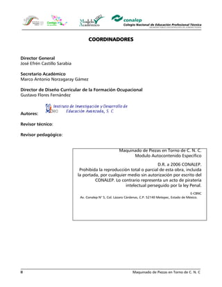 Este documento presenta un manual para estudiantes sobre maquinado de piezas en torno CNC. El manual contiene información sobre diseñar procesos de maquinado, programar torno CNC y elaborar piezas en torno CNC. El contenido incluye análisis de información de diseño, características de máquinas, hojas de procesos, programación, sistemas de coordenadas y uso de herramientas. El objetivo es que los estudiantes aprendan a programar y fabricar piezas metálicas en torno CNC de acuer