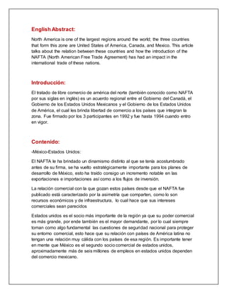 El documento describe las relaciones comerciales entre los países del NAFTA (Estados Unidos, Canadá y México) desde la implementación del acuerdo en 1994. Explica que el NAFTA ha aumentado significativamente el comercio y la inversión entre los países, con México convirtiéndose en un socio comercial clave para Estados Unidos y Canadá. También destaca la cooperación regulatoria y los lazos culturales y académicos entre los socios del NAFTA.