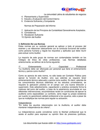 Este documento describe las Normas de Auditoría Generalmente Aceptadas (NAGAS) que rigen la práctica de la auditoría en el Perú. Explica que las NAGAS se originaron en Estados Unidos y fueron adoptadas en Perú en 1968. Actualmente hay 10 normas agrupadas en 3 categorías: normas generales, normas de ejecución del trabajo, y normas de preparación del informe. El documento procede a definir cada una de las 10 normas.