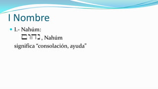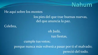Este documento presenta a Dios como soberano sobre la naturaleza y los pueblos. Aunque es lento para la ira, no dejará sin castigo a los culpables y se vengará de los adversarios de Israel. Anuncia la destrucción de Nínive, la capital de Asiria, como juicio divino por su crueldad.
