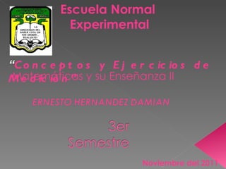 Este documento presenta conceptos y ejercicios relacionados con la medición en matemáticas. Define la medición como un proceso de comparar una magnitud con una unidad estandar para determinar su tamaño. Explica sistemas de unidades como el Sistema Internacional y el Sistema Inglés. Incluye ejercicios prácticos de medición y conversión de unidades. El objetivo es que los maestros conozcan estos conceptos para aplicarlos en el aula.