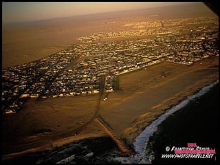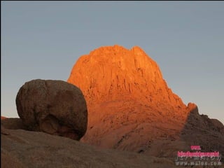 Namibia es un país del sudoeste de África que limita con Angola, Zambia, el océano Atlántico, Botswana y Sudáfrica. La mayor parte del país es árida y desértica, dominada por el desierto de Namibia y con escasa precipitación. Alberga parques naturales como Etosha, conocido por su diversidad de vida silvestre, y el cañón Fish River, el segundo más grande del mundo. La economía depende de la minería, especialmente diamantes y uranio.