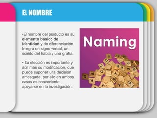 Este documento describe los aspectos fundamentales del nombre de un producto o compañía. Explica que el nombre es un elemento clave de identidad y diferenciación, y debe ser breve, sonar bien y ser fácil de recordar. Además, debe transmitir una buena imagen, adaptarse a la funcionalidad del producto y potenciar su personalidad. Finalmente, provee ejemplos de tipologías de nombres como descriptivos, simbólicos y patronímicos.