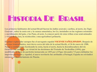 Este documento presenta información sobre la historia, geografía, cultura, política, población, religión y economía de Brasil. Los primeros habitantes fueron tribus indígenas como los Tupí-Guarani. Portugal reclamó el territorio en 1500 después de que exploradores como Cabral y Vespuccio llegaran a sus costas. Brasil se ha convertido en la nación más grande y poderosa de América del Sur, con una población diversa y una economía en crecimiento.