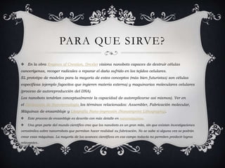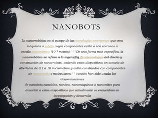 Los nanobots son robots a escala nanométrica que se están investigando y desarrollando. Estos dispositivos tienen un tamaño de entre 0,1 y 10 micrómetros y están compuestos de componentes a escala nanométrica o molecular. Se espera que los nanobots puedan realizar tareas como destruir células cancerosas, recoger radicales o reparar daños celulares. Sin embargo, muchos científicos creen que los nanobots son actualmente un concepto muy futurista debido a las limitaciones actuales de la tecnolog