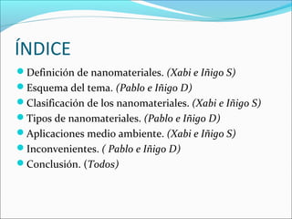 Este documento presenta una introducción a los nanomateriales. Incluye una definición, clasificación en tipos como nanopartículas, nanotubos y nanocapas, y discute aplicaciones ambientales e inconvenientes potenciales como riesgos a la salud y saturación en productos de consumo. Concluye que los nanomateriales pueden usarse para mejorar la tecnología y la vida cotidiana si se controlan adecuadamente los riesgos.
